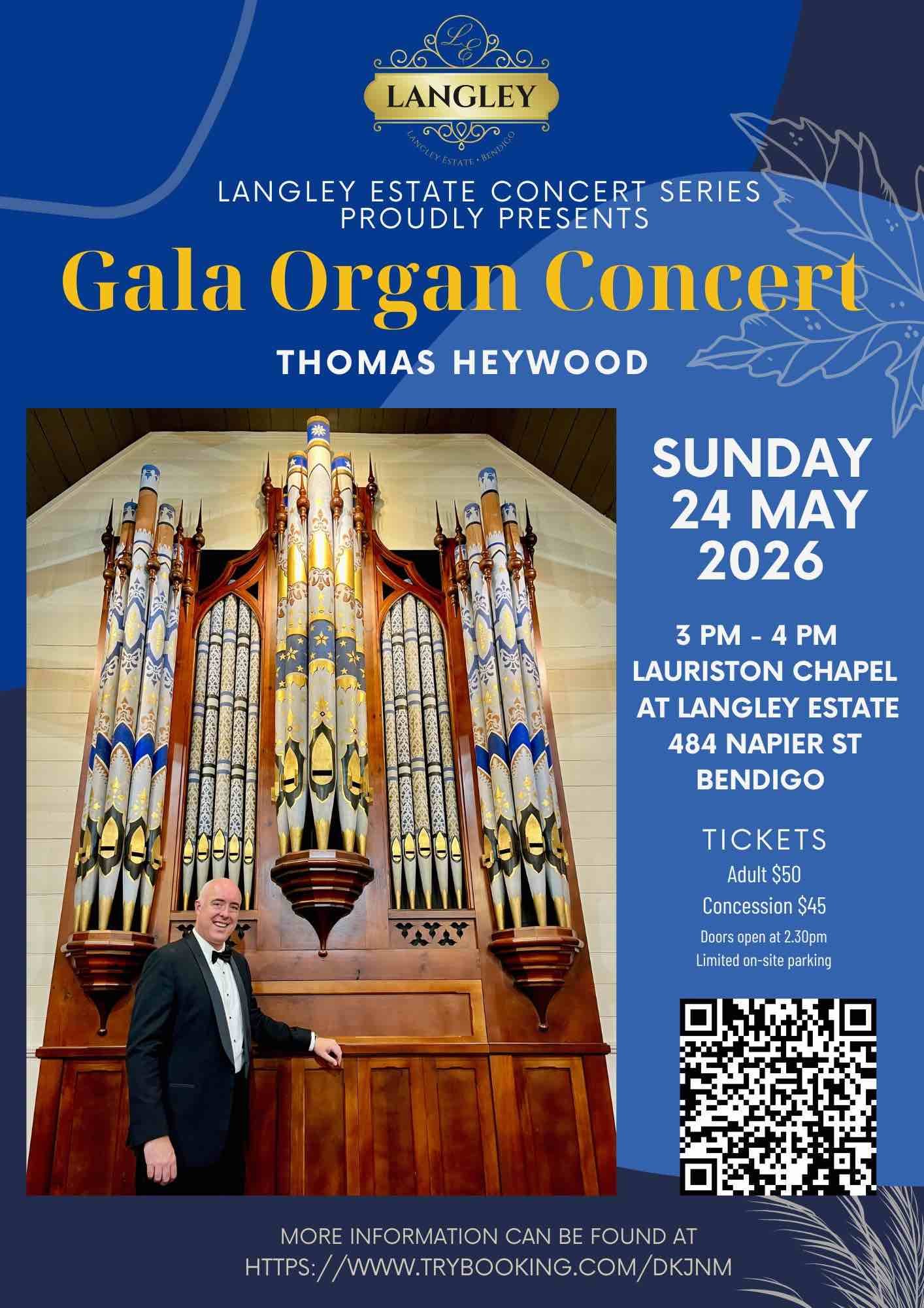 Featuring a Deluxe Menu from Bendigo’s own Whisk catering, a special performance by Thomas Heywood on the historic 1875 pipe organ in the Lauriston Chapel and an unforgettable guided tour of Langley Estate, including the Langley Hall mansion.